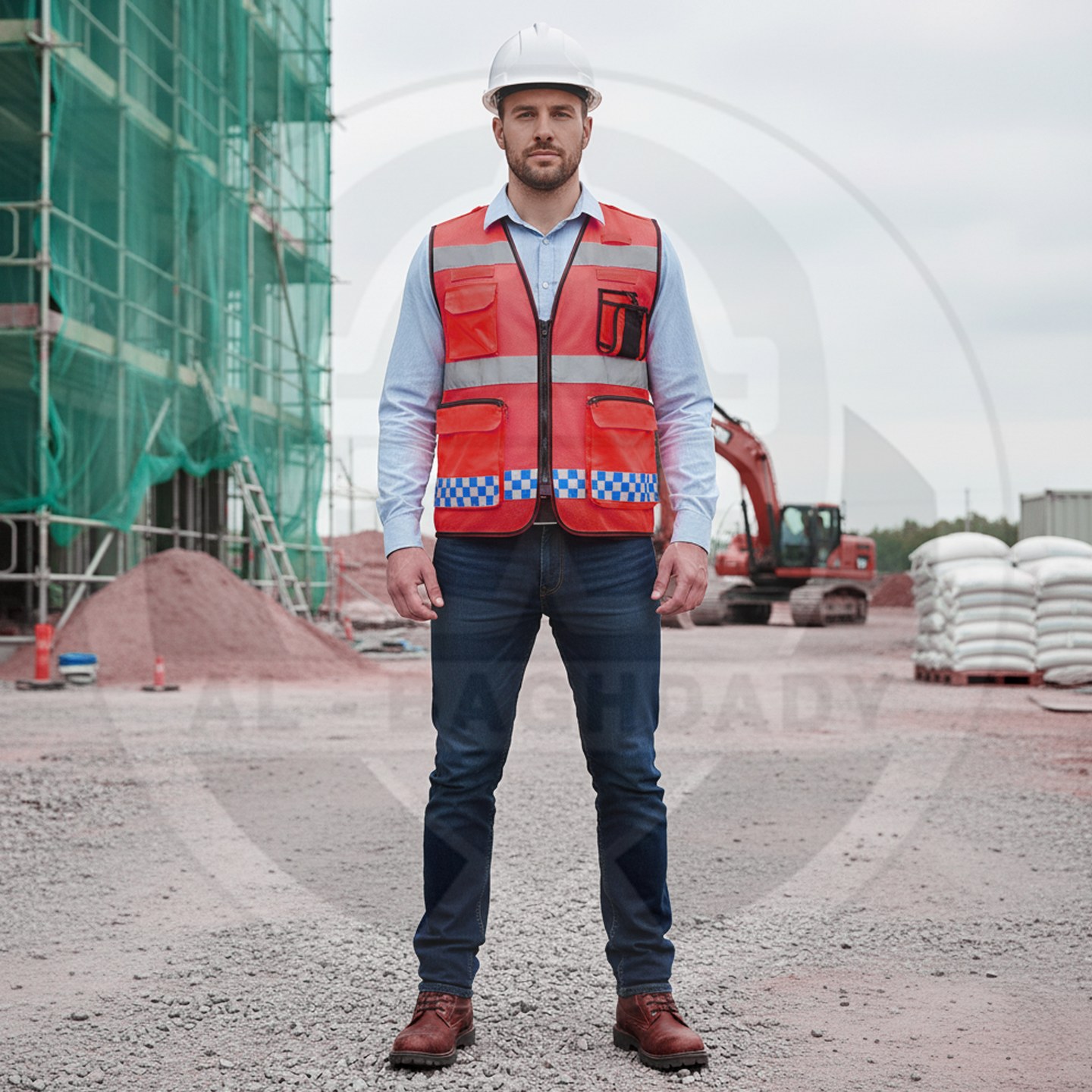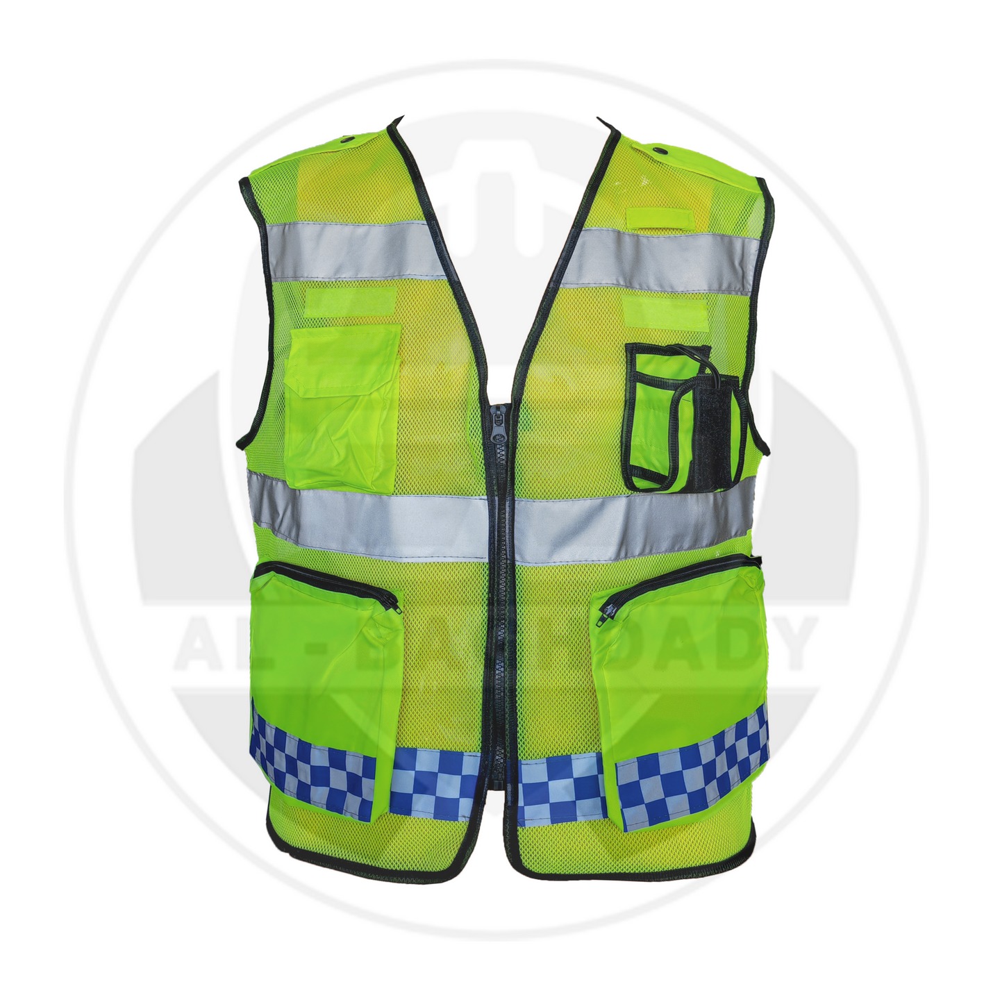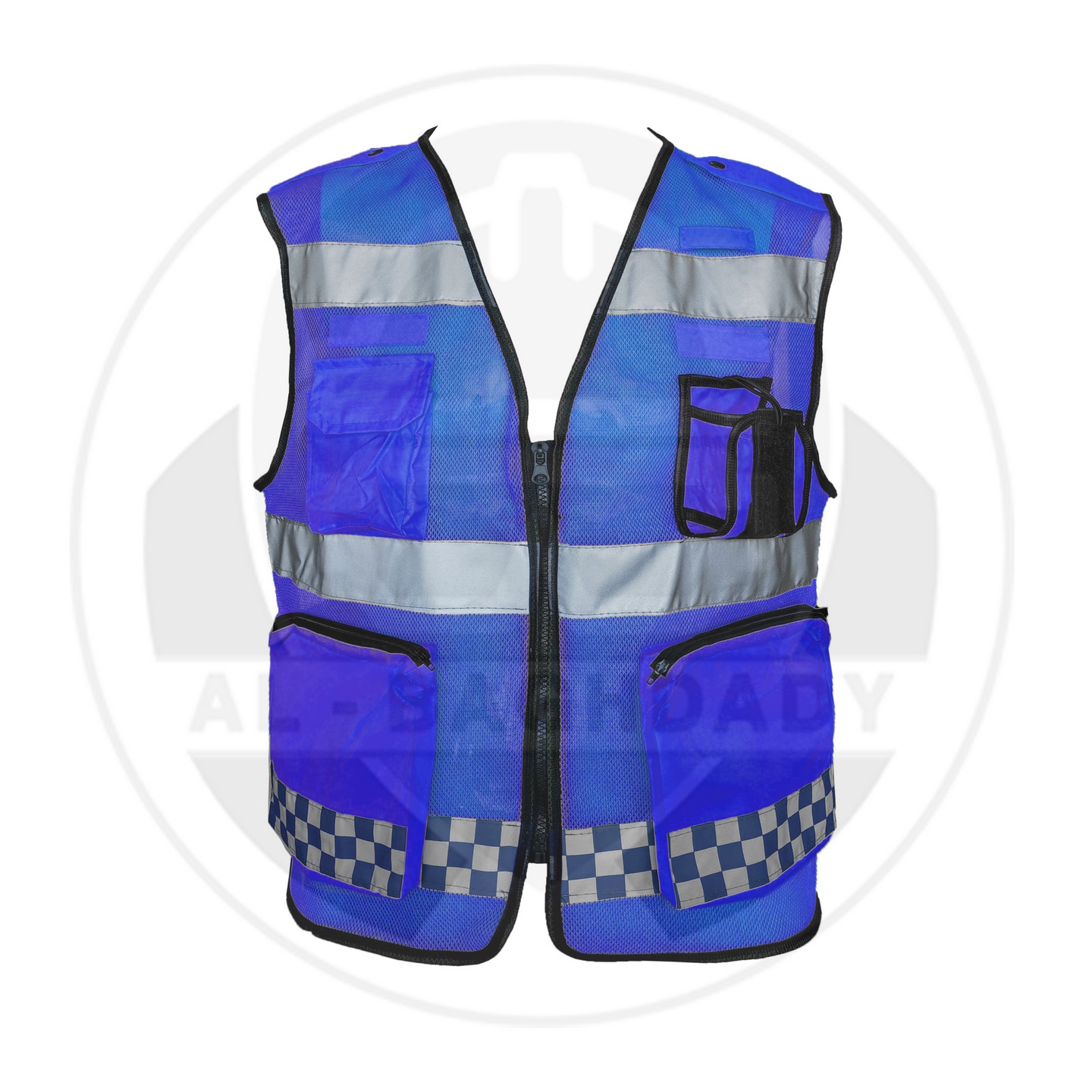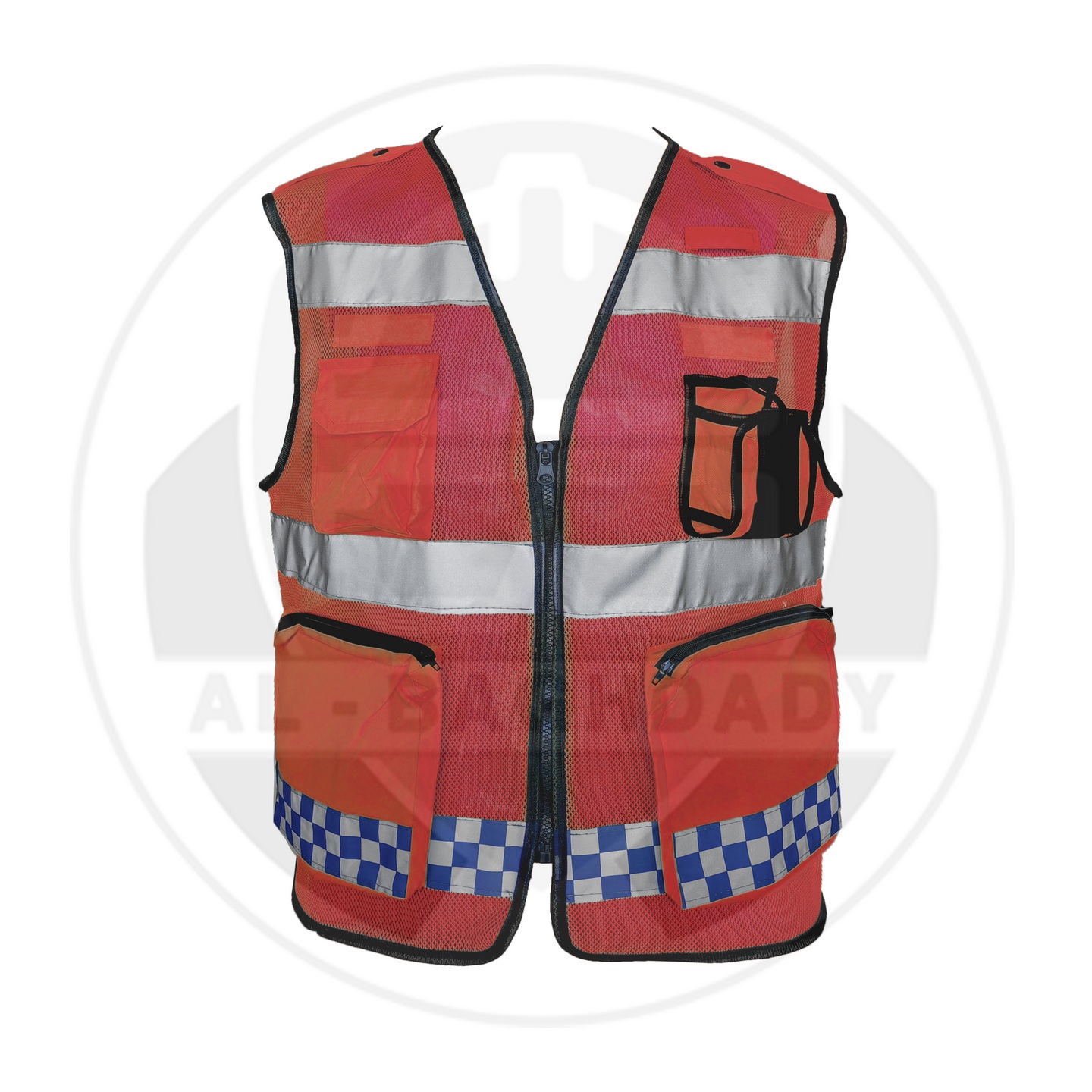 وصف المنتج : سترة سلامة ذات خامة ممتازة من البوليستر الخالص مع أشرطة تحذير عاكسة و 4 جيوب خارجية مع أشرطة الرتب على الكتف