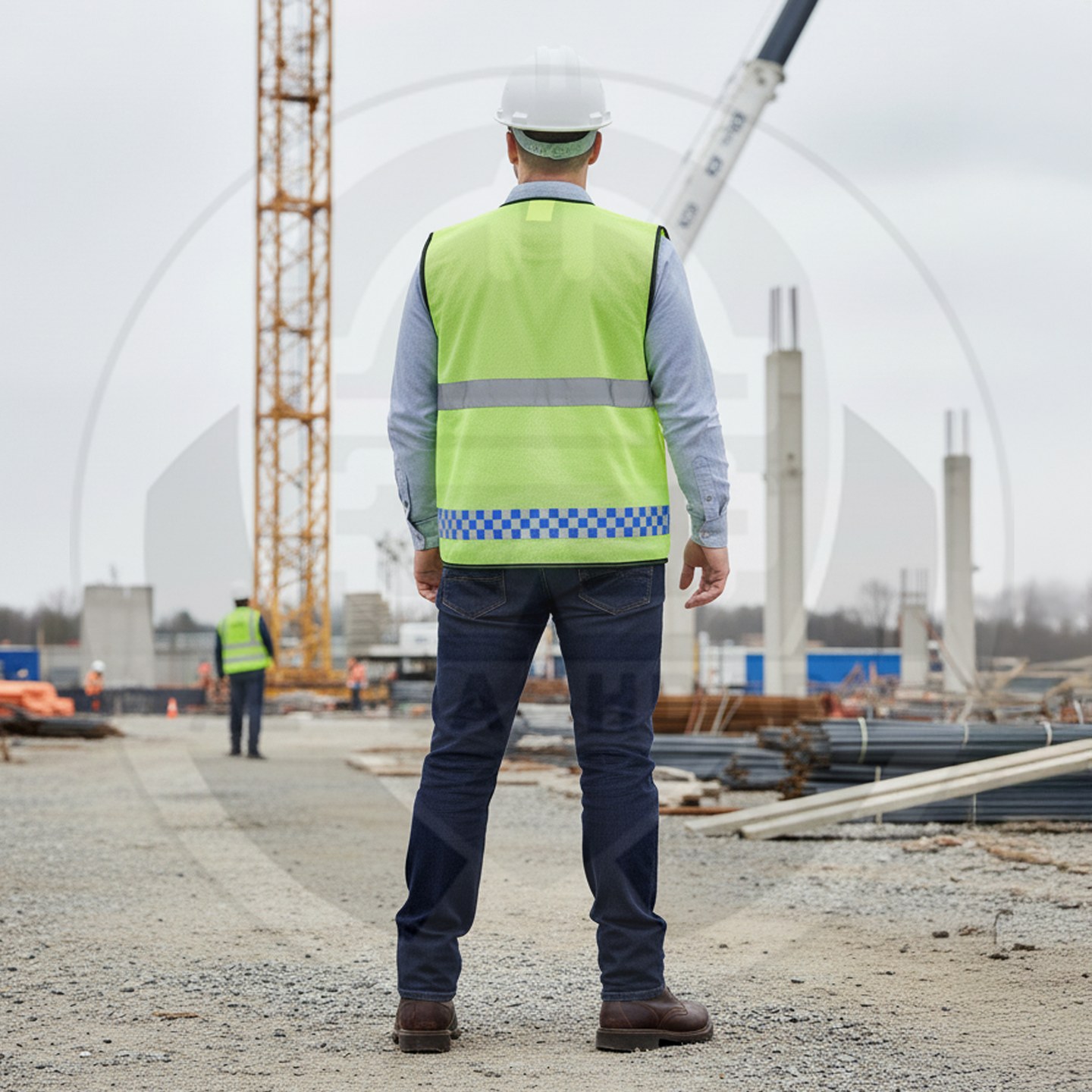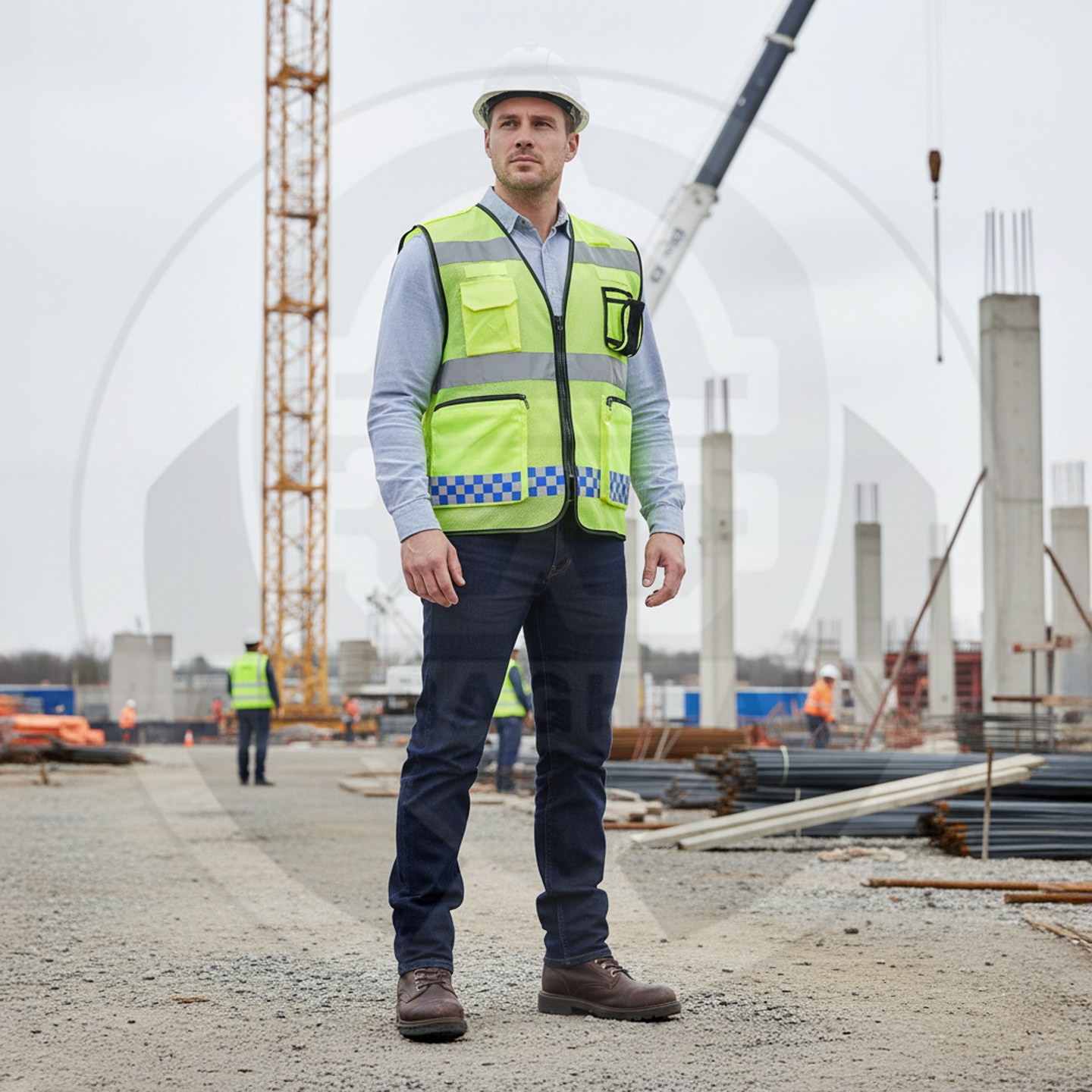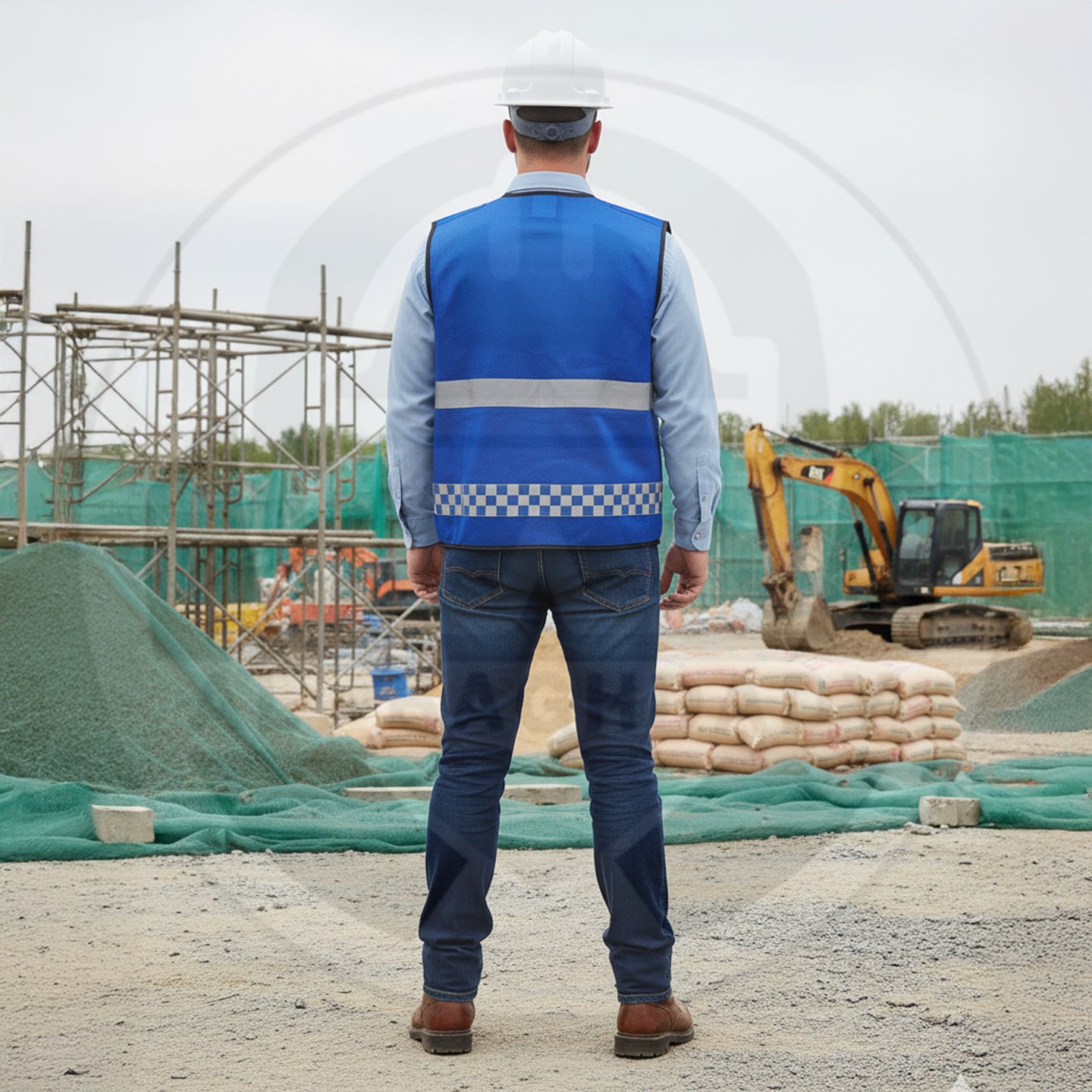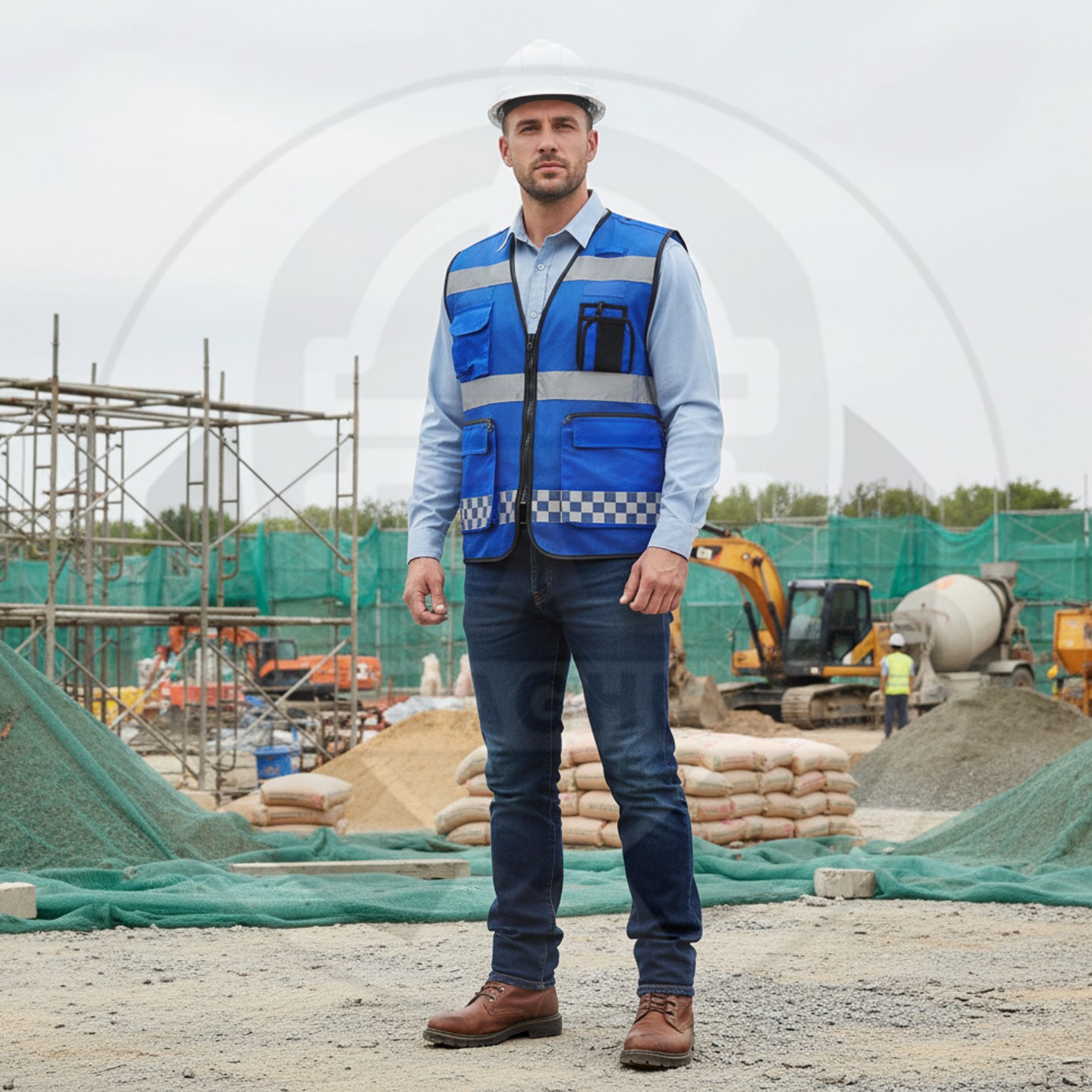 وصف المنتج : سترة سلامة ذات خامة ممتازة من البوليستر الخالص مع أشرطة تحذير عاكسة و 4 جيوب خارجية مع أشرطة الرتب على الكتف