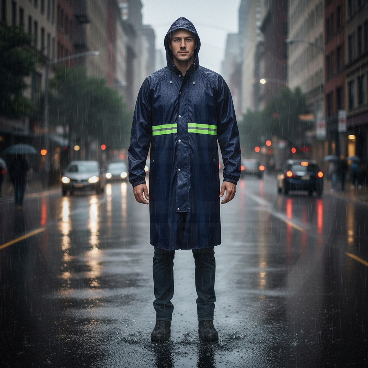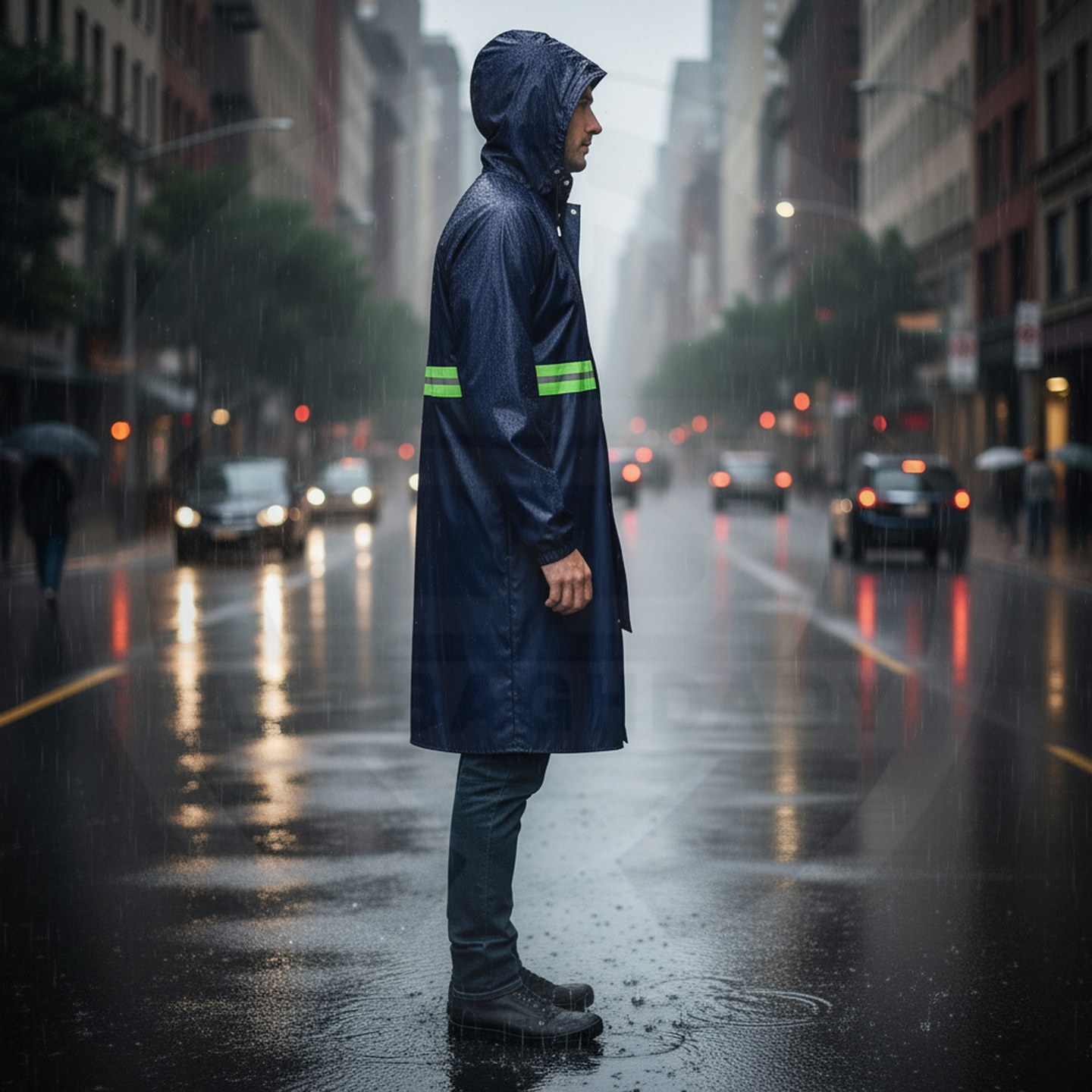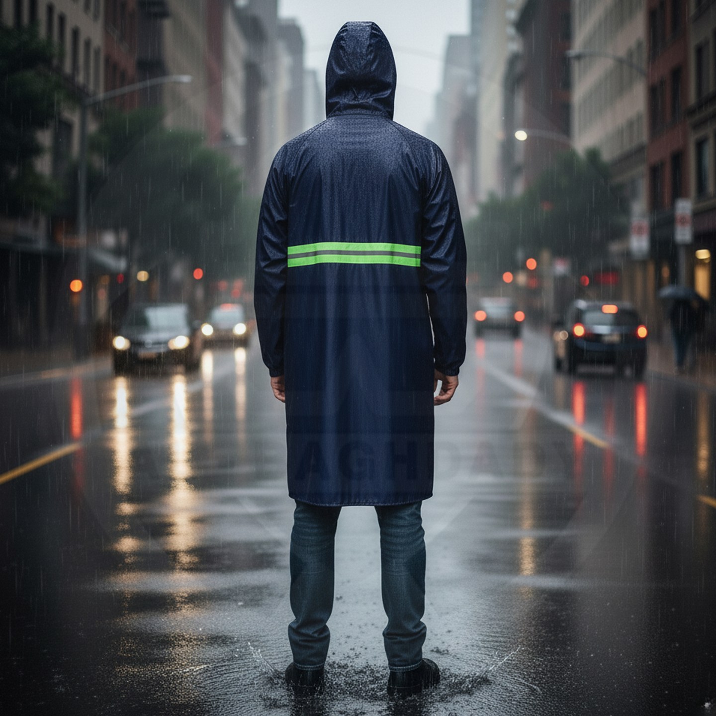 وصف المنتج : معطف مطري قطعة واحدة من شركة Hq مصنوع من مادة الـ PVC الثقيل المقاوم للامطار والبلل يحتوي على جيبين خارجيين وشريط عاكس في المنتصف