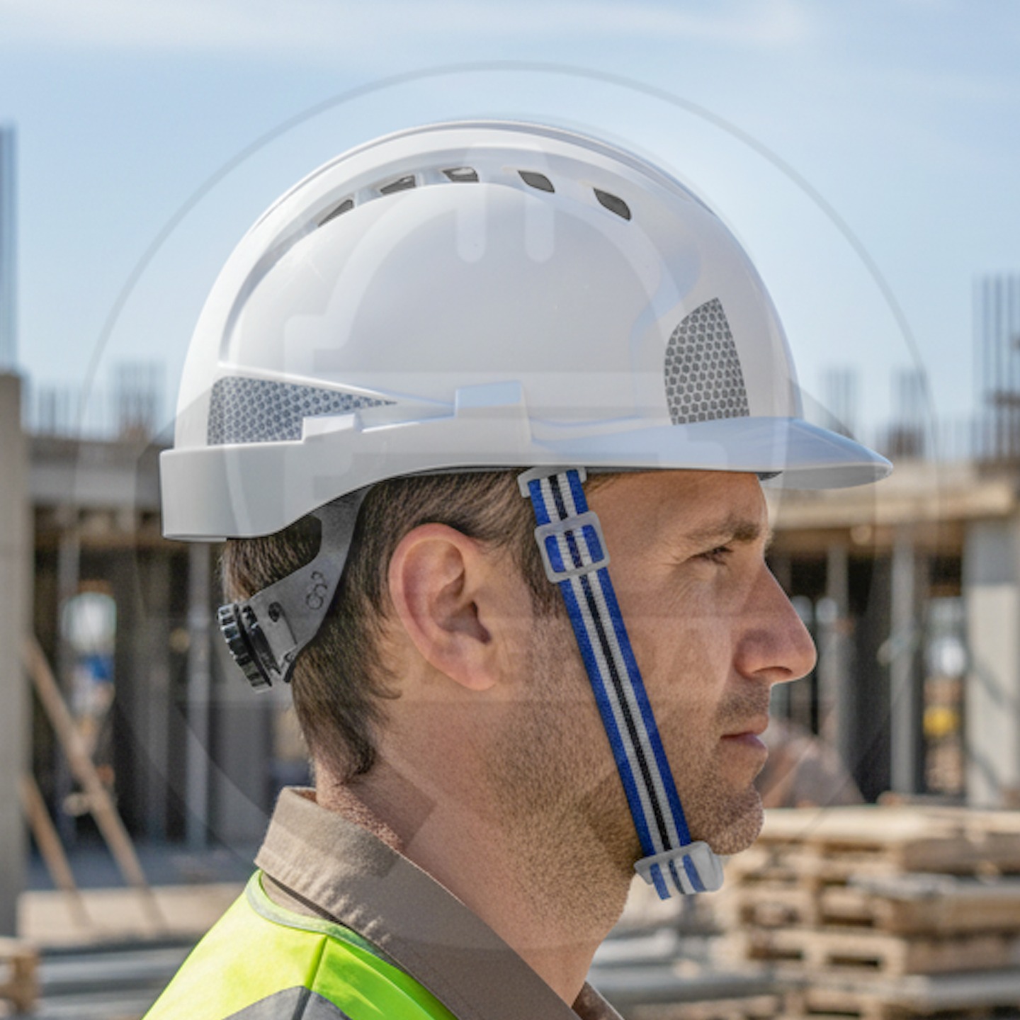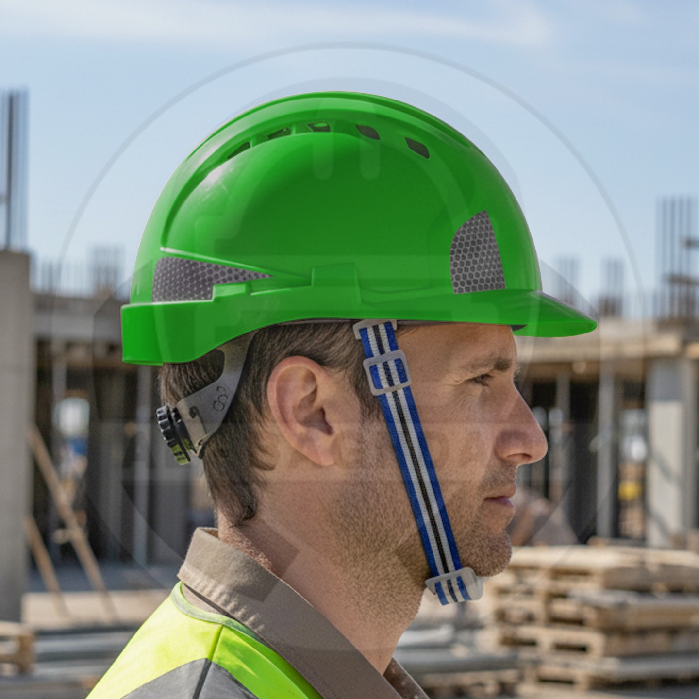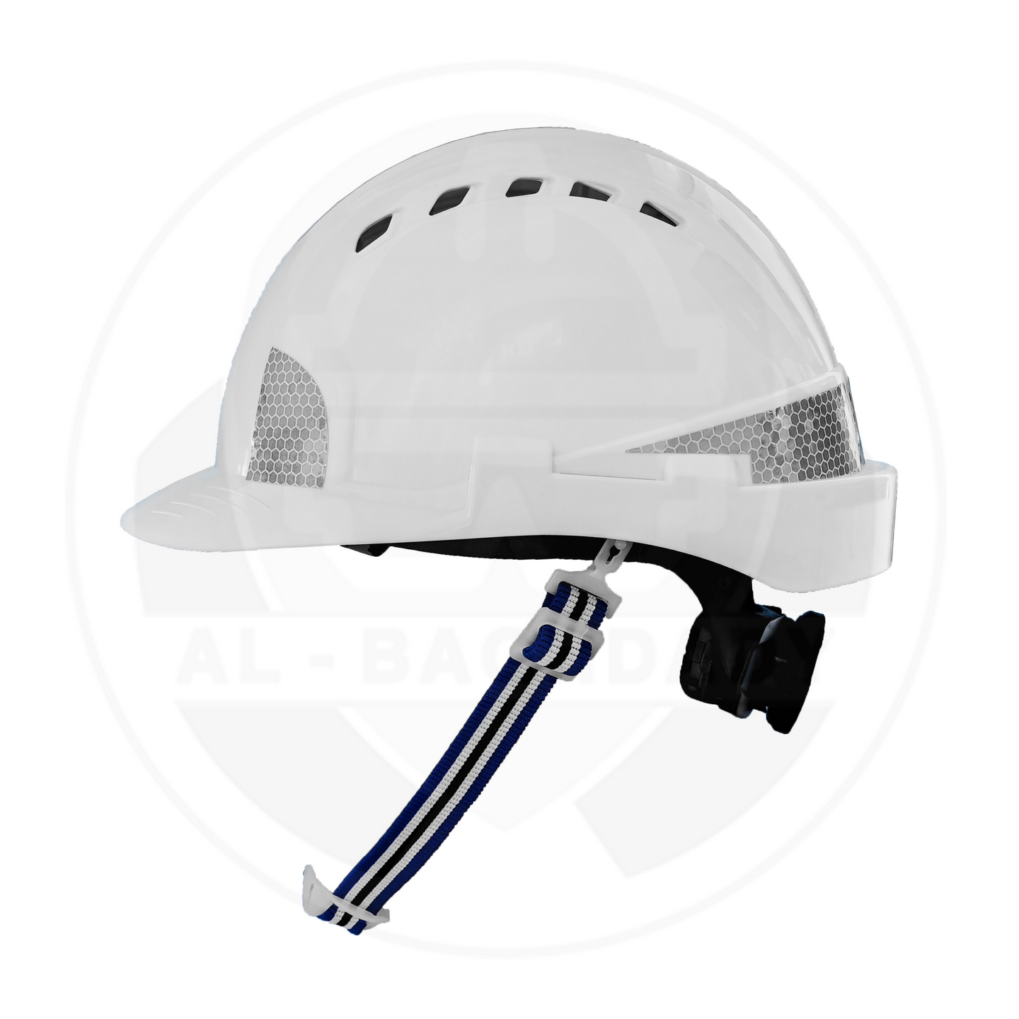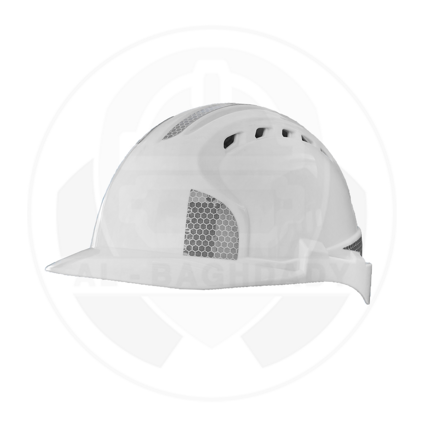 وصف المنتج : خوذة سلامة ممتازة من شركة SW مزودة بأخاديد رأس مريحة وحزام تثبيت حول الحنك مع ملصقات عاكسة للسلامة