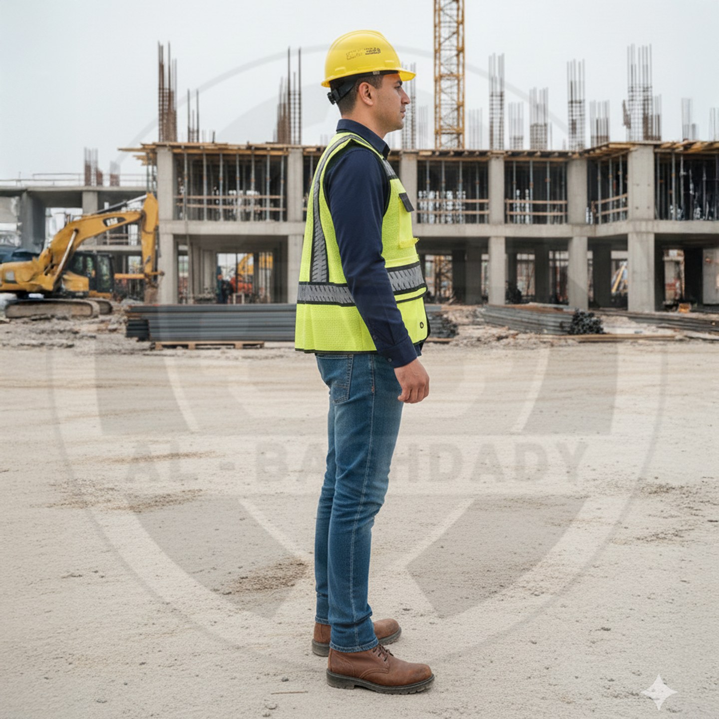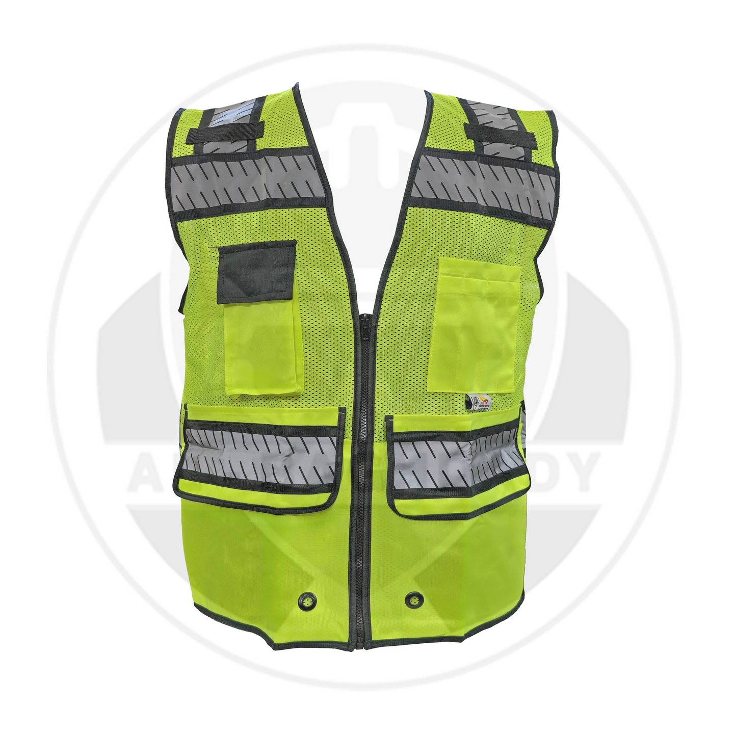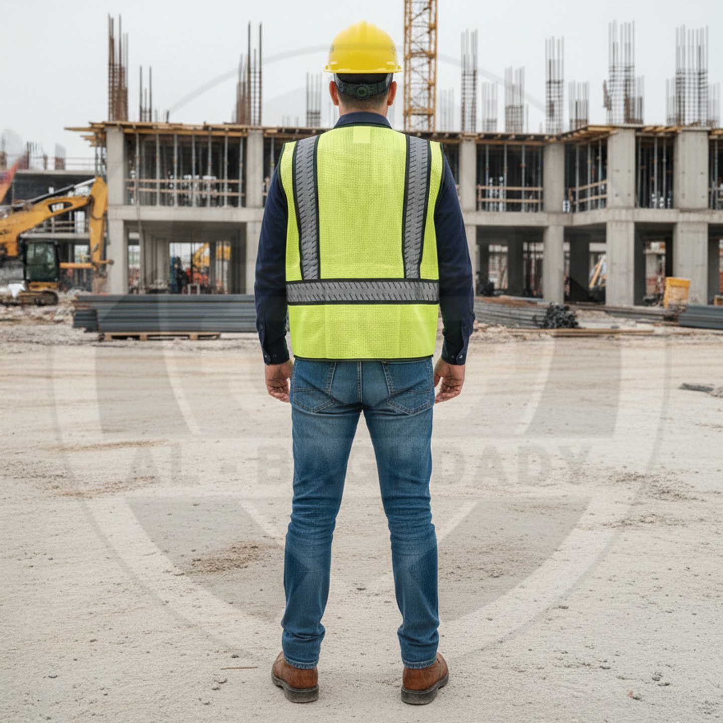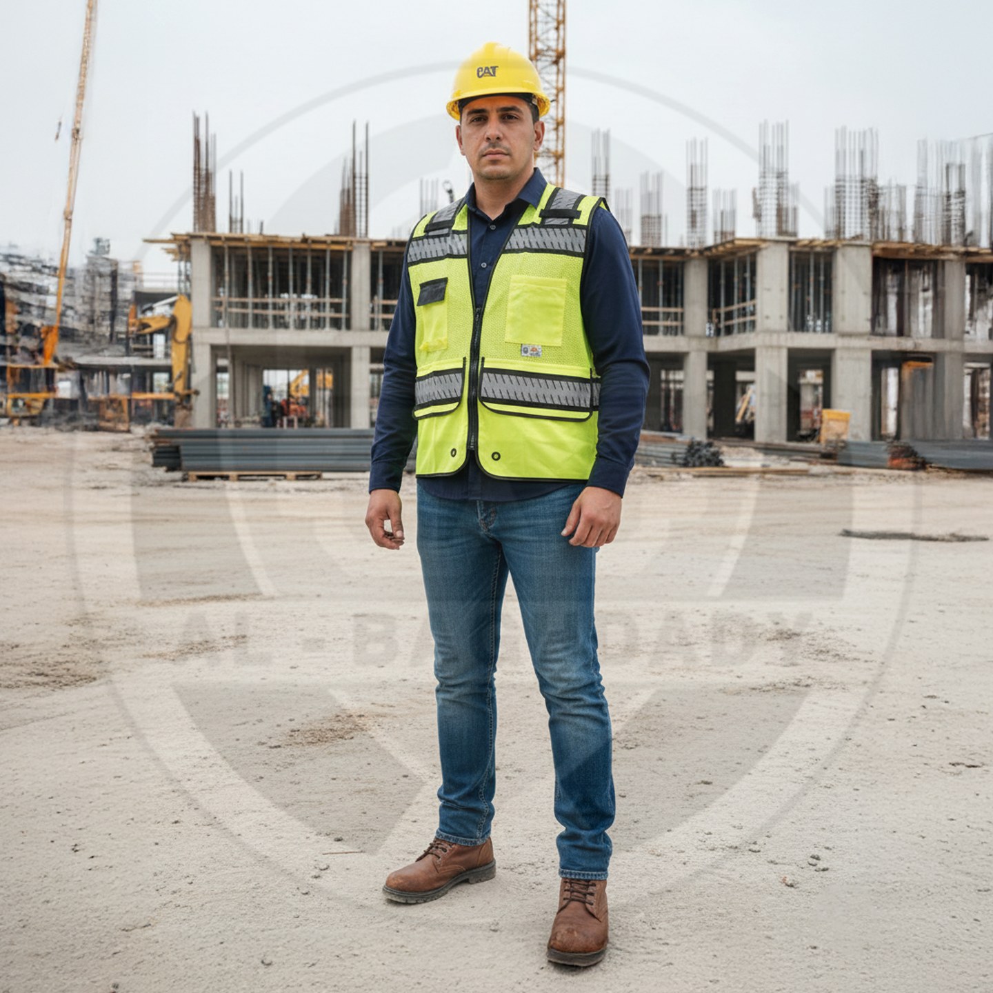 وصف المنتج : سترة سلامة ذات خامة ممتازة من البوليستر الخالص مع أشرطة تحذير عاكسة و 4 جيوب خارجية