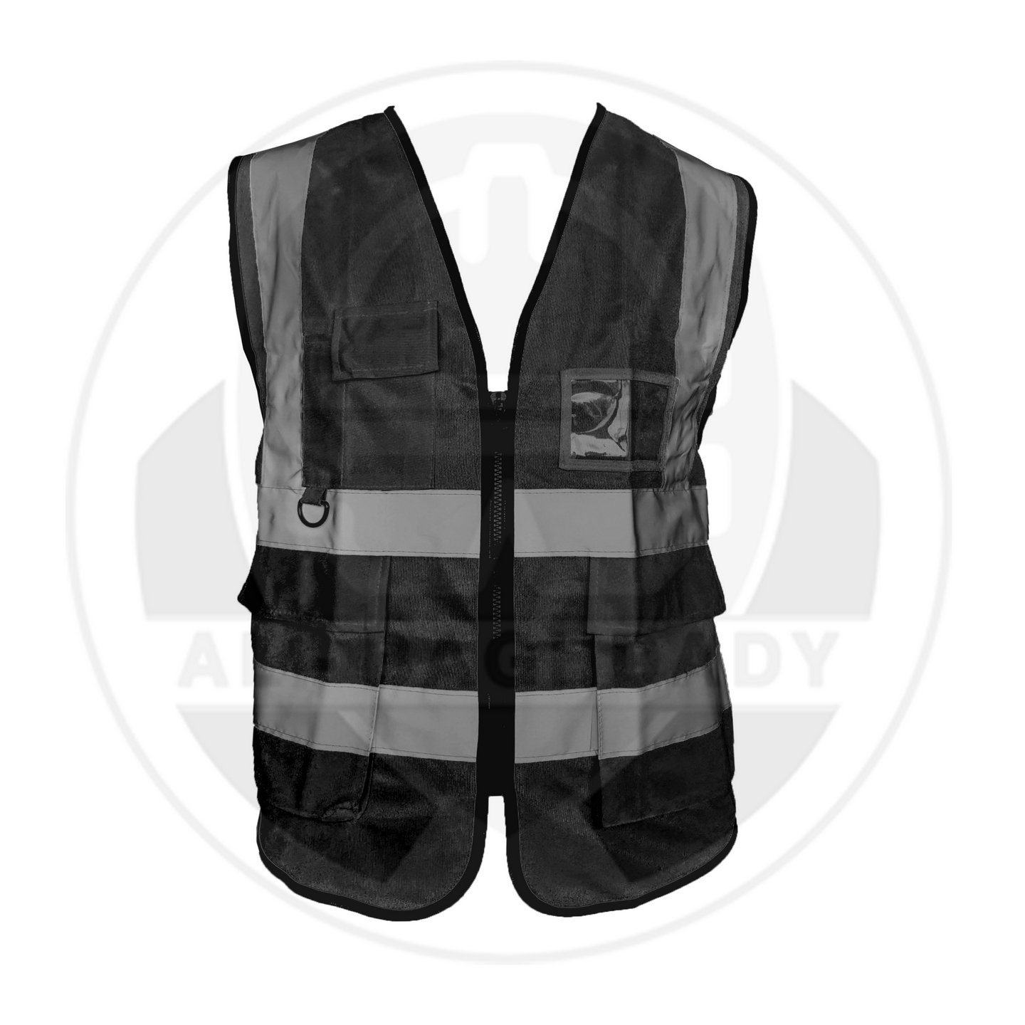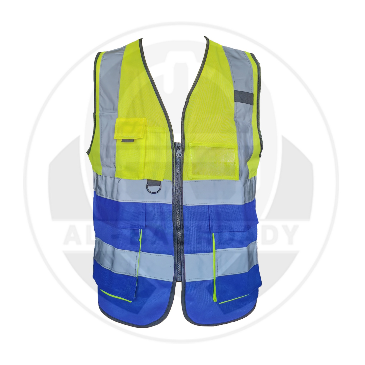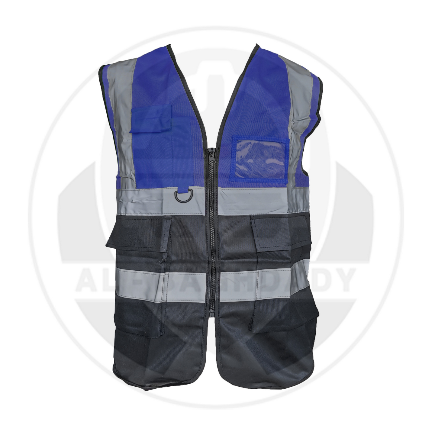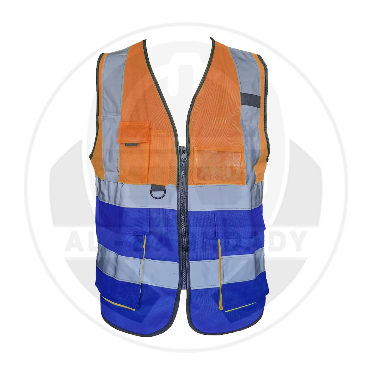 وصف المنتج : سترة سلامة ممتازة لونين ذات خامة ممتازة من البوليستر الخالص مع أشرطة تحذير عاكسة و 5 جيوب خارجية